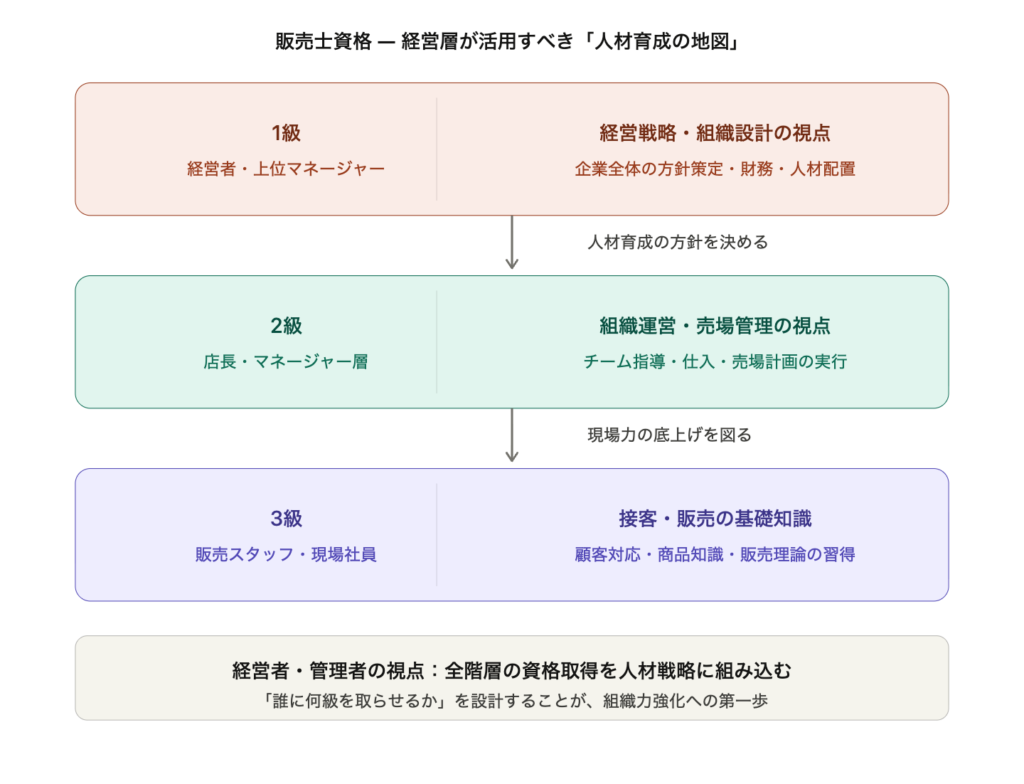 3級でまず現場の基礎を固め、将来のマネージャー候補には2級の取得を組織として後押しし、幹部候補には1級の視点を身につけさせる。