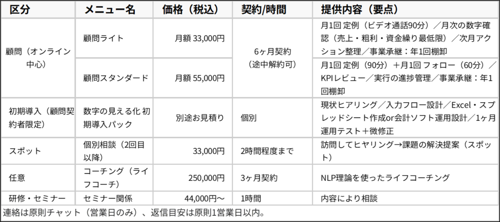 対象:従業員0〜5名規模の小規模事業者様で、まず「数字」と「経営の型(会議体)」を整えたい方。
